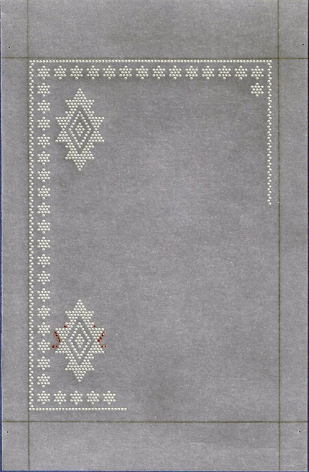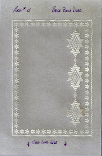 Okay, now we have the three embossed designs placed inside the border and you can either leave them 'unattached' to each other or attach them as the printed pattern shows. Don't be alarmed if when you attach them, as I chose to do, they may be one, or two, grid holes difference. If you look VERY close to my template, you will see my diamond shape between the middle and bottom embossed design is a four dot diamond and the one between the top and middle embossed design is only a three dot diamond. It's okay folks....nothing HAS to be absolutely perfect!!!